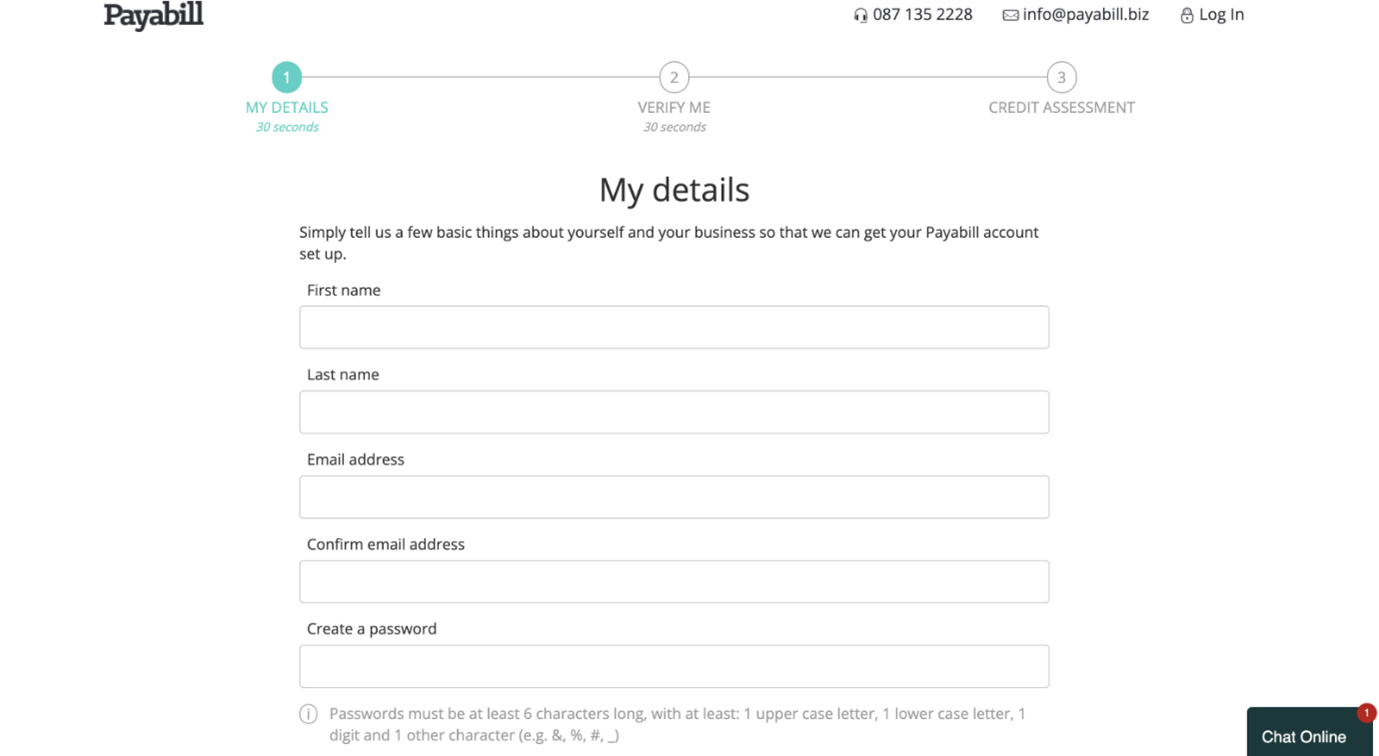 The Payabill website will direct you accordingly to complete the application. Should there be any queries that arise during the application process, you can click on the Chat Online button in the bottom right-hand corner and one of their agents will assist.