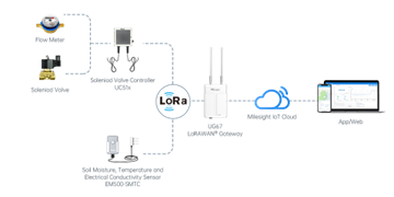 Let's look at a solution from Milesight that offer the whole smart irrigation solution including a soil moisture sensor, solenoid valve controller, and the Outdoor LoRaWAN gateway. By adopting Milesight smart irrigation, operations are streamlined, resulting in water and energy savings. When the soil moisture sensor detects a deficiency, it will send out an alter to the cloud-hosted management platform to inform users through app notifications or e-mails. Users can manage irrigation remotely based on the data, through the solenoid valve controller. LoRaWAN consumes less power when compared to alternative IoT technology and allows for battery operation. The whole smart irrigation solution is easy to deploy due to its simple and intuitive architecture.