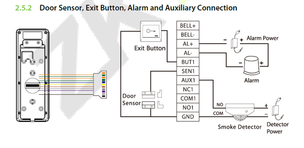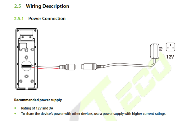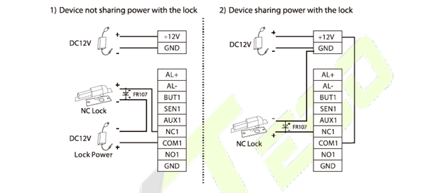 The system supports both Normally Opened Lock and Normally Closed Lock. The NO Lock (normally opened when powered) is connected with ‘NO1’ and ‘COM1’ terminals, and the NC Lock (normally closed when powered) is connected with ‘NC1’ and ‘COM1’ terminals. The power can be shared with the lock or can be used separately for the lock, as shown in the example with NC Lock below: