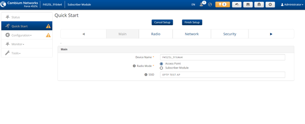 From Quick Start, ensure that the Radio Mode is set to Access Point and enter the SSID that the SM will connect to.
