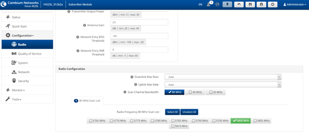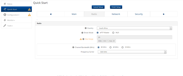 From the Radio Tab, ensure that the Country is set to South Africa. From the Driver Mode option, select ePTP Master. From the Channel Bandwidth (MHz) you can opt for either 80MHz, 40MHz or 20MHz. When selecting the channel bandwidth, keep in mind that larger channel bandwidths do provide higher potential throughput, with the drawback of distance limit. Lower channel bandwidths will provide greater link distances, with reduced potential throughput. From the Frequency Carrier drop-down, you can select the frequency of operation. We highly recommend that you use the built-in spectrum analyser at both the AP and SM to get the best frequency of operation that is clear from interference.