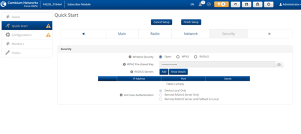 From the Security tab, you can select either Open (no authentication), WPA2 (authenticate using a pre-shared key), or Radius (authenticate using a username and password). We recommend using WPA2 with a pre-shared key to allow the SM to authenticate with the access point.