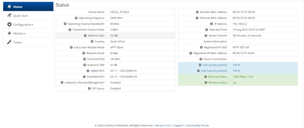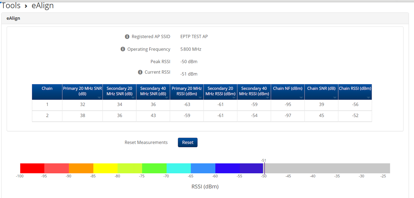 Another great tool that we recommend using when installing the CB-EPMP-F4525L in a PtP setup is the eAlign tool. This gives you a real-time indication of the Receive Signal Strength Indicator (RSSI). To maintain high modulation and maximum throughput, you want a value that is around -50dBm to -65dBm.