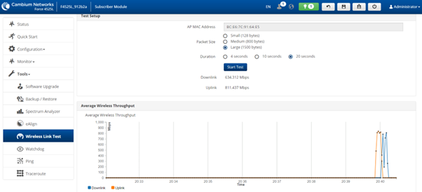 In our lab environment, we ran a Wireless Link Test, which is accessible under the Tools menu. We opted for 20 seconds duration with large (1500 bytes) packets and our downlink results were 643Mbps and uplink of around 811Mbps, providing an aggregate speed of 1445Mbps.