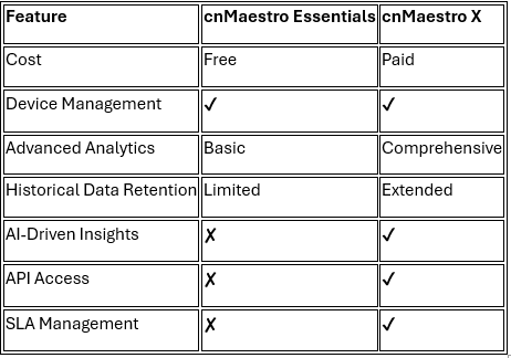If you’re just starting or managing small networks, Essentials is a perfect no-cost solution. However, if scalability, predictive analytics, and SLA assurance are critical, cnMaestro X justifies its investment by providing an unparalleled level of control and insight.