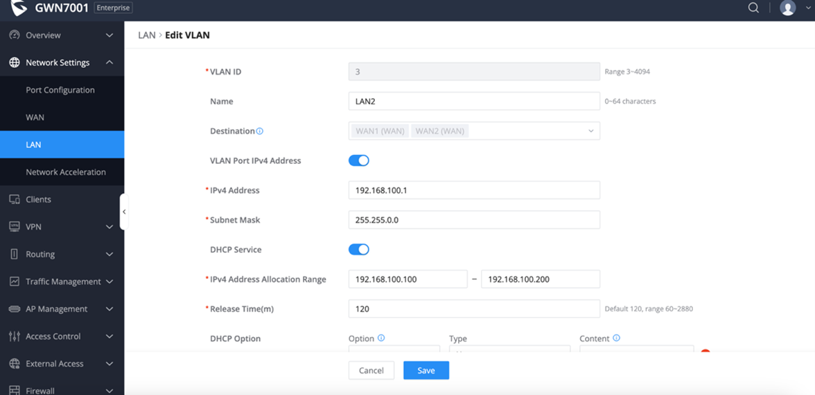 First, add a VLAN ID, add a name, and configure your IPv4, Subnet settings accordingly. You can also enable the DHCP service and set the range. Once completed, simply click on Save.
