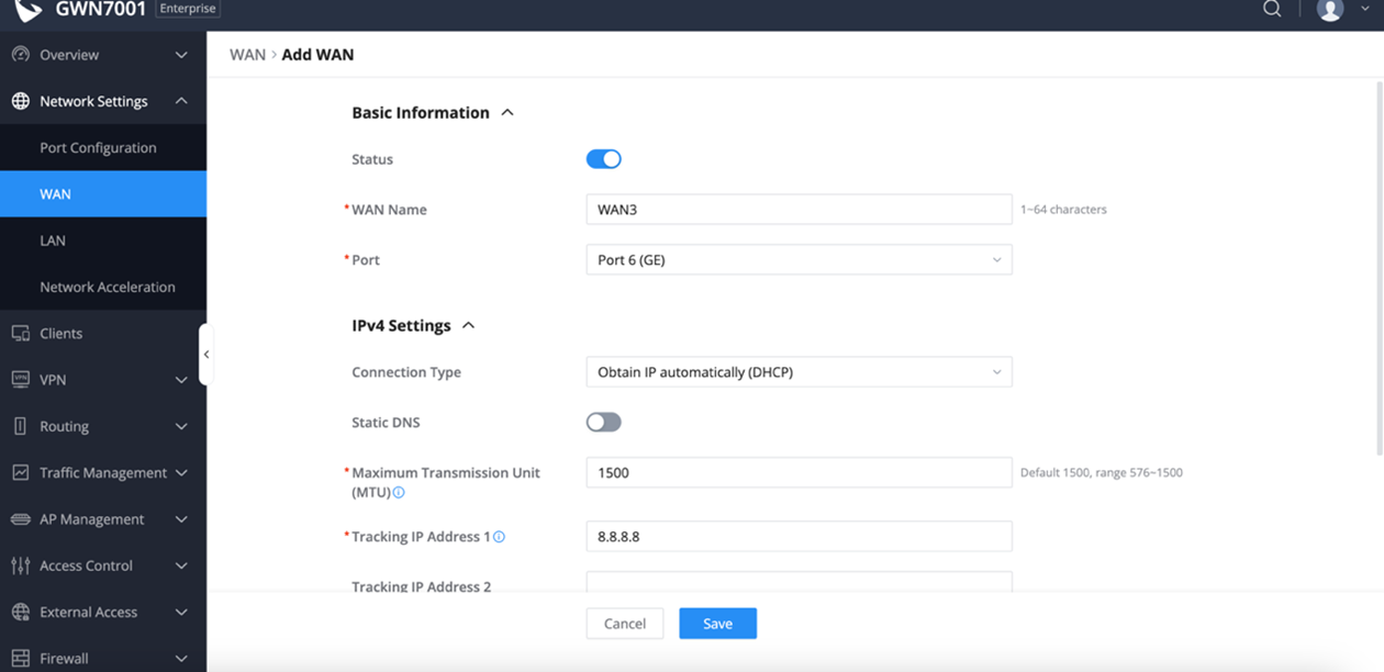 Change the Status to Enabled, name your WAN, and select the port that you will be connecting the second uplink to. From here you change the IPv4 setting accordingly and once completed simply click Save and connect the second uplink.