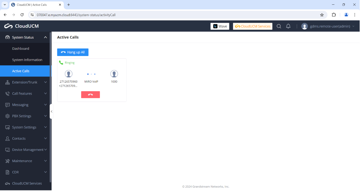 Now from the Wave app, let’s make an outbound call and monitor it in Active Calls. Here we can see that extension 1000 is calling MiRO: