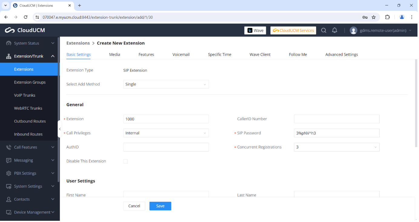 Here we are going to setup a very basic extension. You will have options to create a single extension or batch extensions, add user details like Names and email addresses. For now, we are just going to add one extension and leave our passwords as generated.
