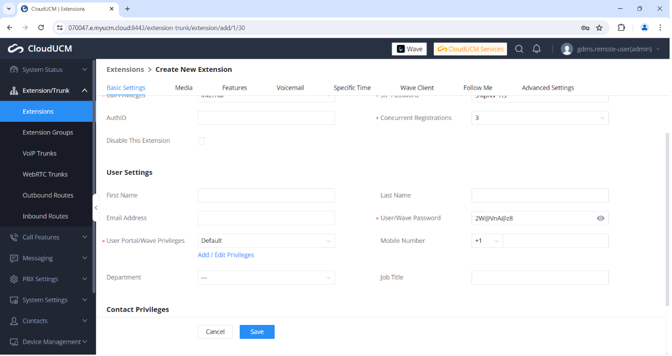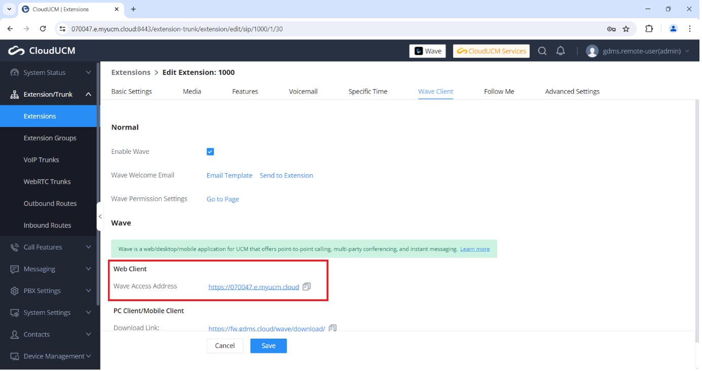 We would like to setup our extension with the Grandstream Wave application. So, remember to scroll down and take note of the User/Wave password: