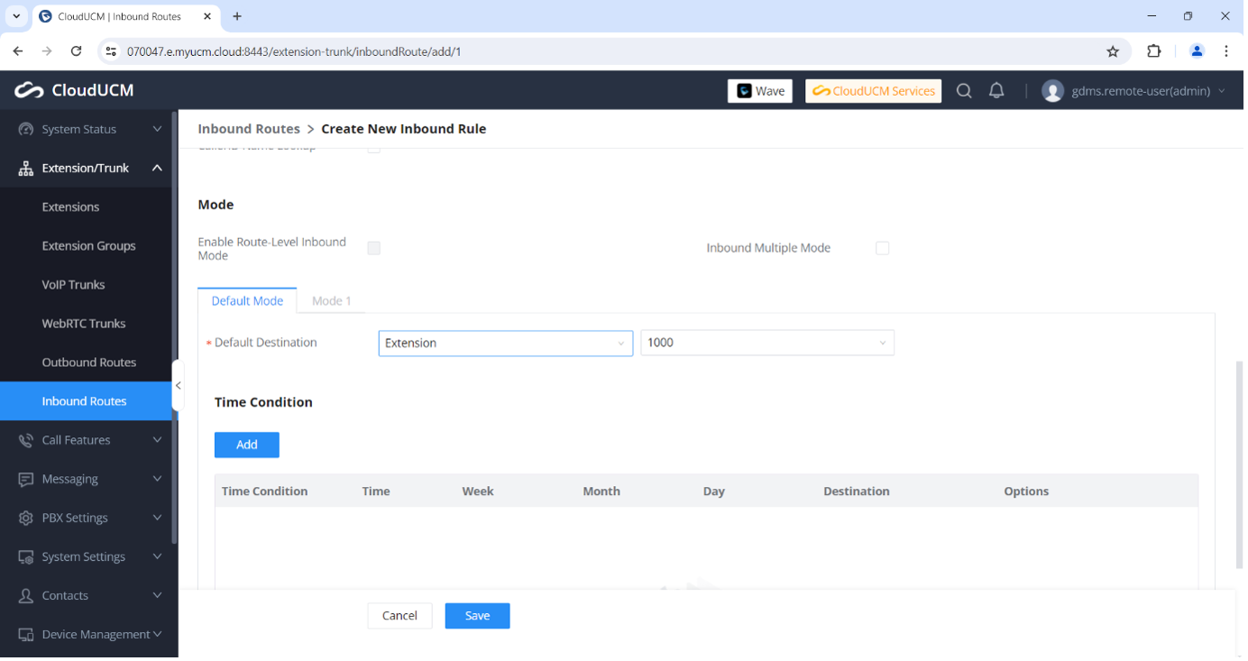 Scroll down until you find Mode. Here we would like to tell the inbound route what to do when a call comes in. You might have multiple extensions with Ring Groups, or perhaps an IVR system that automatically answers the call with Options to choose but for this example, we can tell the inbound call to simply go to extension 1000. Once you have selected your preferred option, click on Save and Apply Changes: