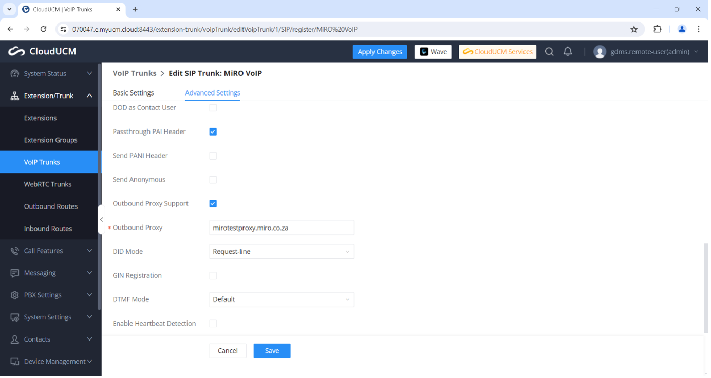 Once the trunk is open, at the top click on Advanced Settings, then scroll down until you find Outbound Proxy Support and enable the setting. Then type in your Outbound Proxy as needed: