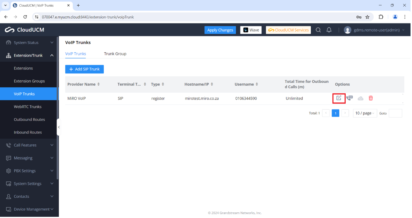 Once you have clicked on Save, you will be returned to the Trunk dashboard. Before we Apply Changes, some providers may give you a specific Outbound Proxy. To find this setting, open the trunk again by clicking on Edit under Options: