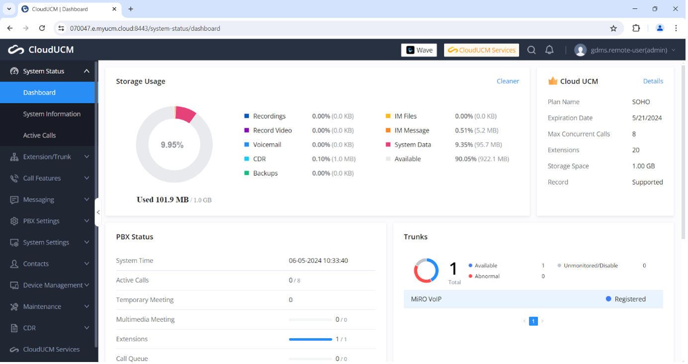 The system will take some time to initiate a connection to the CloudUCM and once completed, you will see your CloudUCM dashboard: