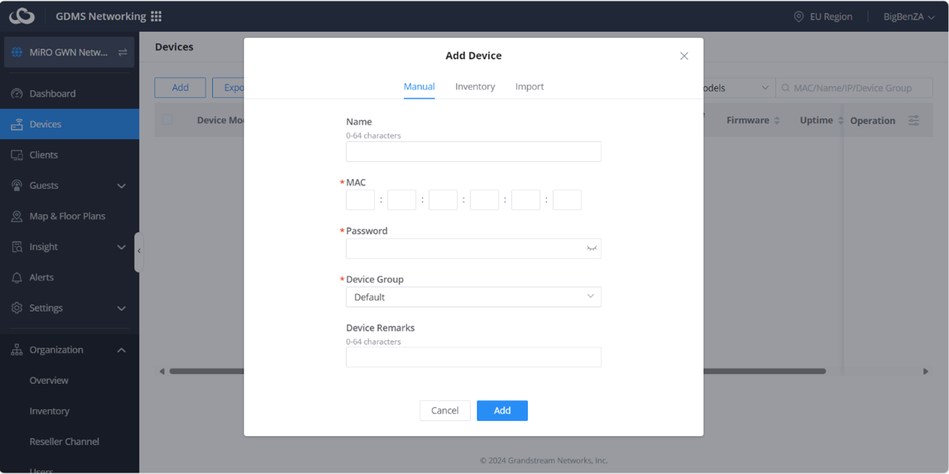 Now that we have our new network, navigate to Devices and click on Add. Ensure that you have the MAC addresses and Passwords of the devices.