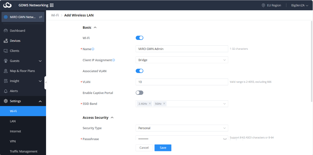 Let's start by creating a Wi-Fi Network. Navigate to Settings > Wi-Fi and click on Add. First, we’ll create the Admin SSID for VLAN 10. Once finished, click on Save: