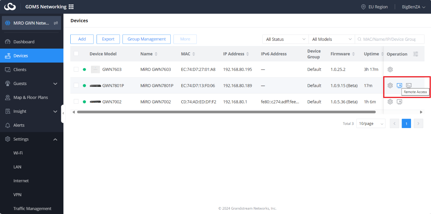 Now that the Wi-Fi and VLANs are added, we have to inform the switch of the VLAN changes. Navigate back to Devices, under Operation of the switch, and click on Remote Access.