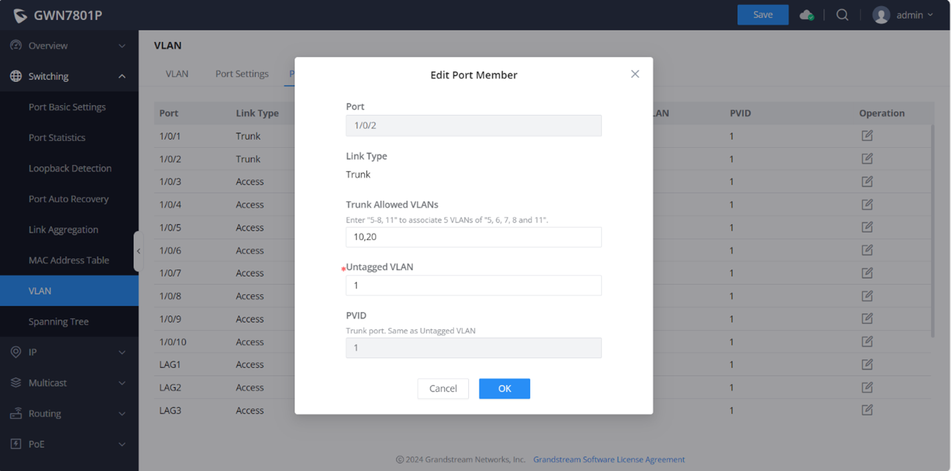 Log in to the switch with the username and password. Once logged in, navigate to Switching > VLANs and click on Port Members. Edit the port where the Access Point I connected and enter the Trunk Allowed VLANs. In our case, 10,20: