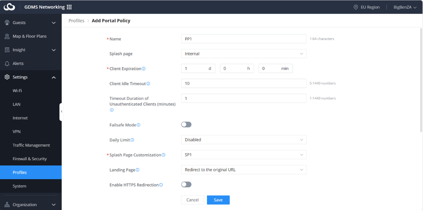 Next, let’s create a Portal Policy. Navigate back to Settings > Profiles and add a new Portal Policy. Remember to select your created Splash Page: