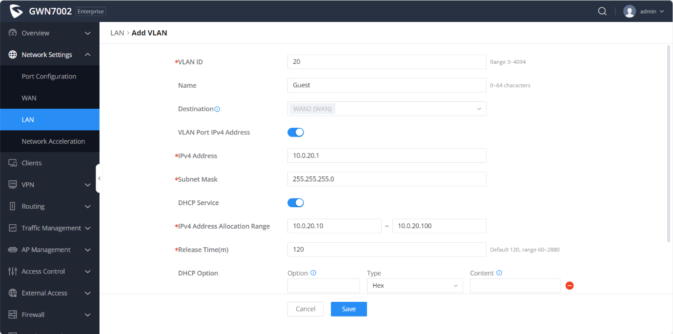 Let’s start by logging into the GWN7002 and setting up VLANs. Navigate to Network Settings > LAN and click on Add VLAN.